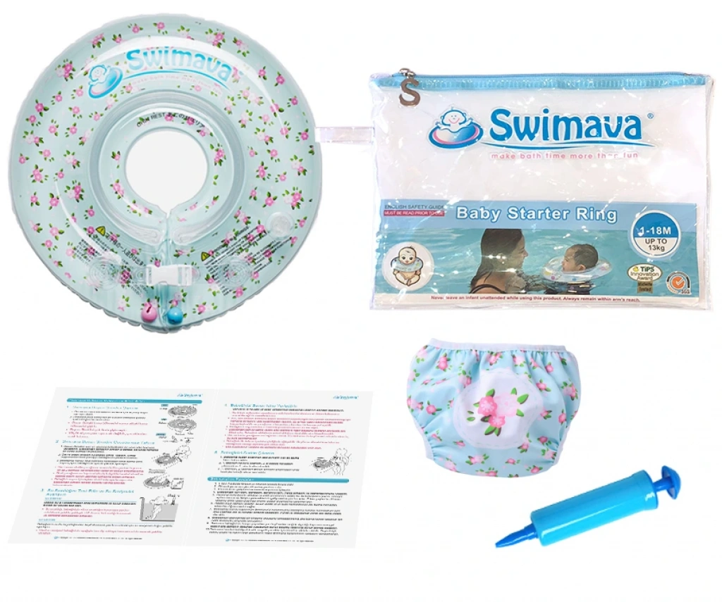 İçindekiler :Swimava boyun simidi, mayo bebek bezi, kullanım kılavuzu, taşıma çantası ve pompa.