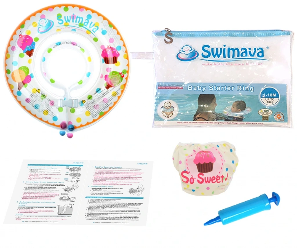 İçindekiler :Swimava boyun simidi, mayo bebek bezi, kullanım kılavuzu, taşıma çantası ve pompa.