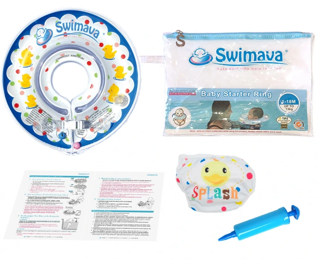 İçindekiler :Swimava boyun simidi, mayo bebek bezi, kullanım kılavuzu, taşıma çantası ve pompa.