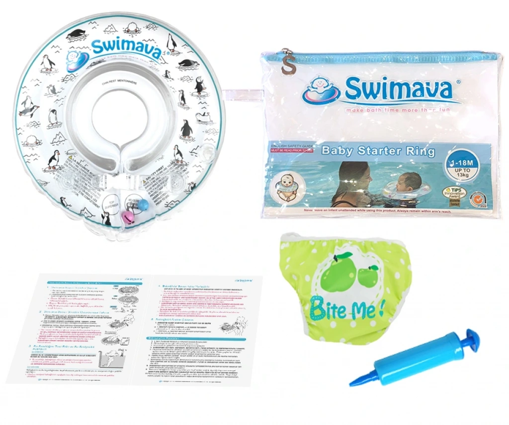 İçindekiler :Swimava boyun simidi, mayo bebek bezi, kullanım kılavuzu, taşıma çantası ve pompa.