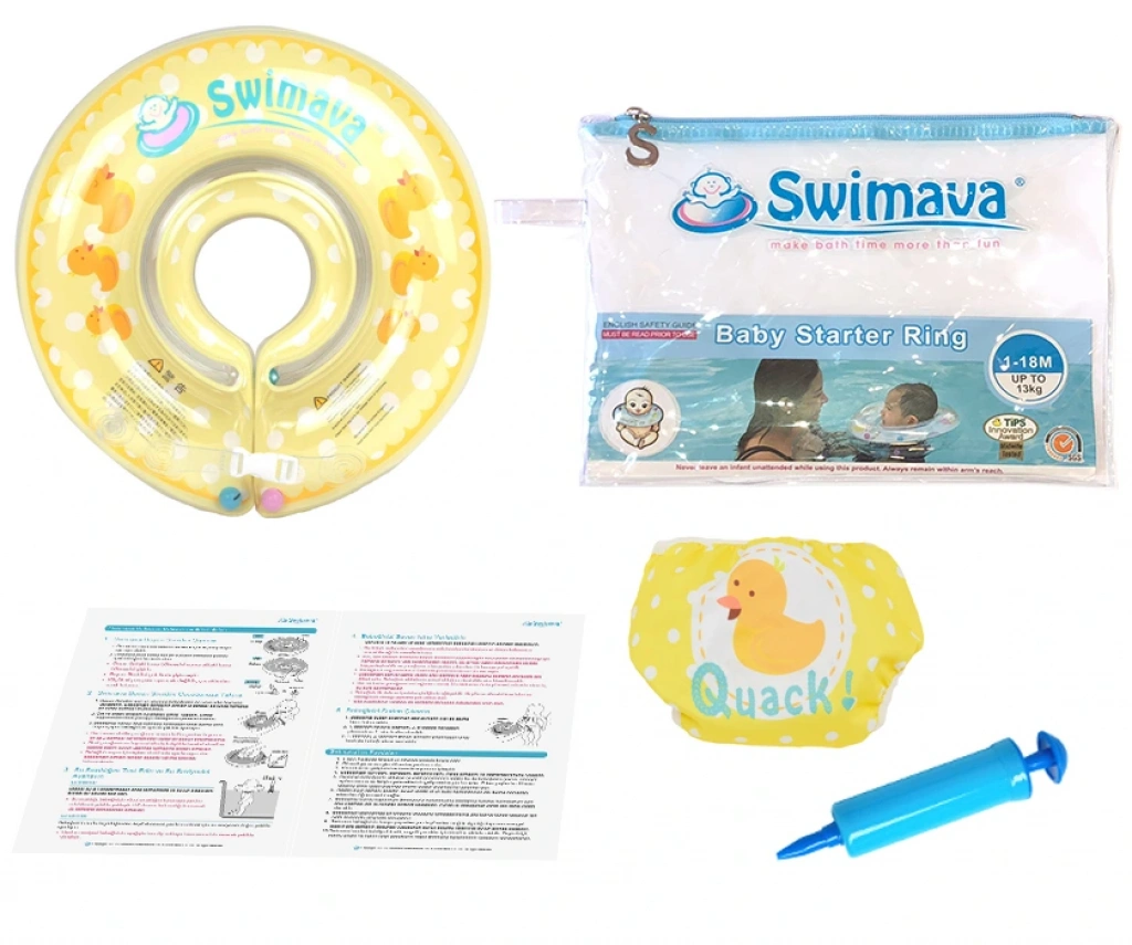 İçindekiler :Swimava boyun simidi, mayo bebek bezi, kullanım kılavuzu, taşıma çantası ve pompa.