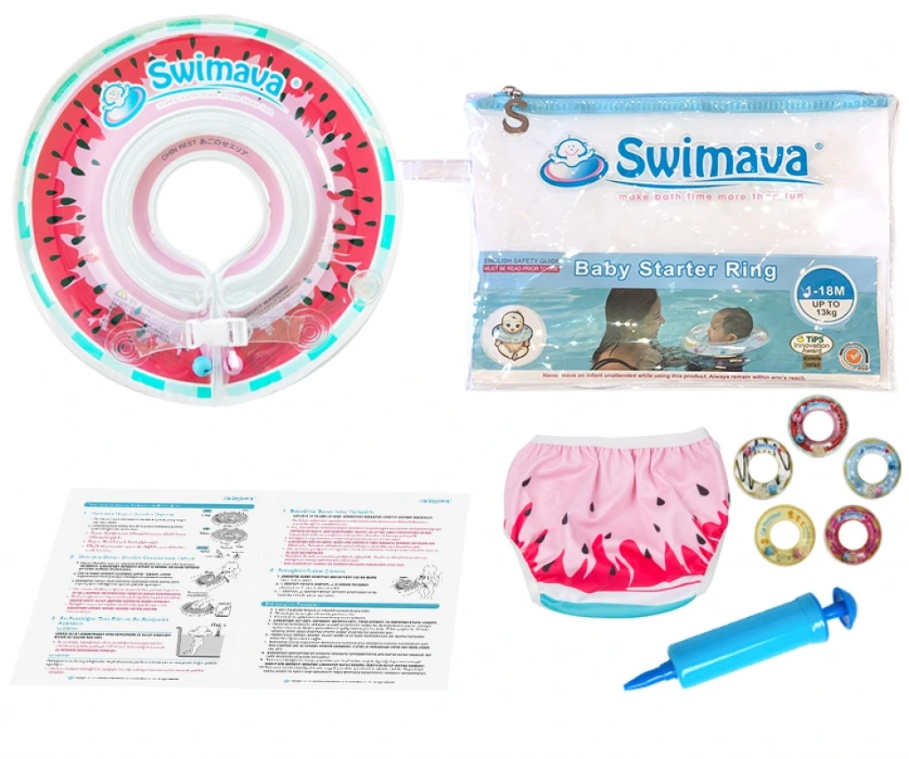 İçindekiler :Swimava boyun simidi, mayo bebek bezi, kullanım kılavuzu, taşıma çantası, pompa, 1 adet Mini Ring (Banyo Oyuncağı)