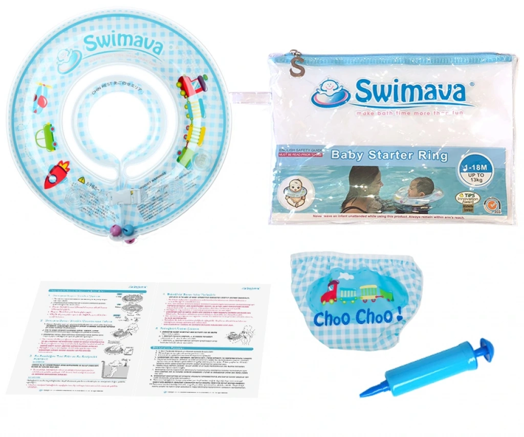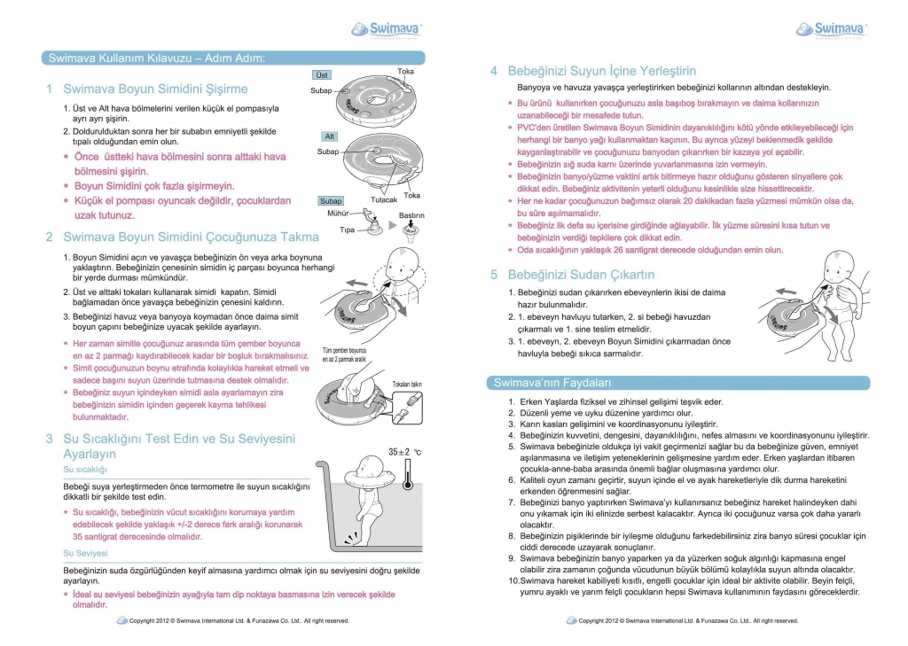 İçindekiler :Swimava boyun simidi, mayo bebek bezi, kullanım kılavuzu, taşıma çantası ve pompa.